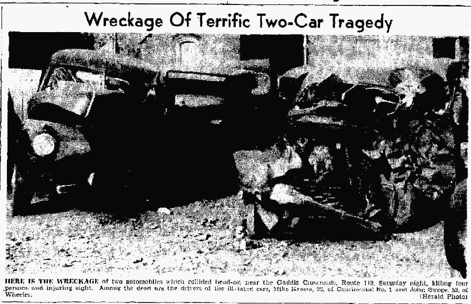 Krassa was dead on arrival at the local hospital at 10:45 p.m. O’Brad succumbed at 11:45 p.m. as the result of internal injuries. In the Swope car traveling towards Wheeler, Mrs. Swope was killed instantly. Mr. Swope died in the local hospital at 2:05 a.m. Sunday.