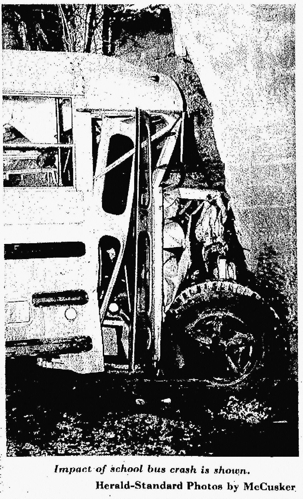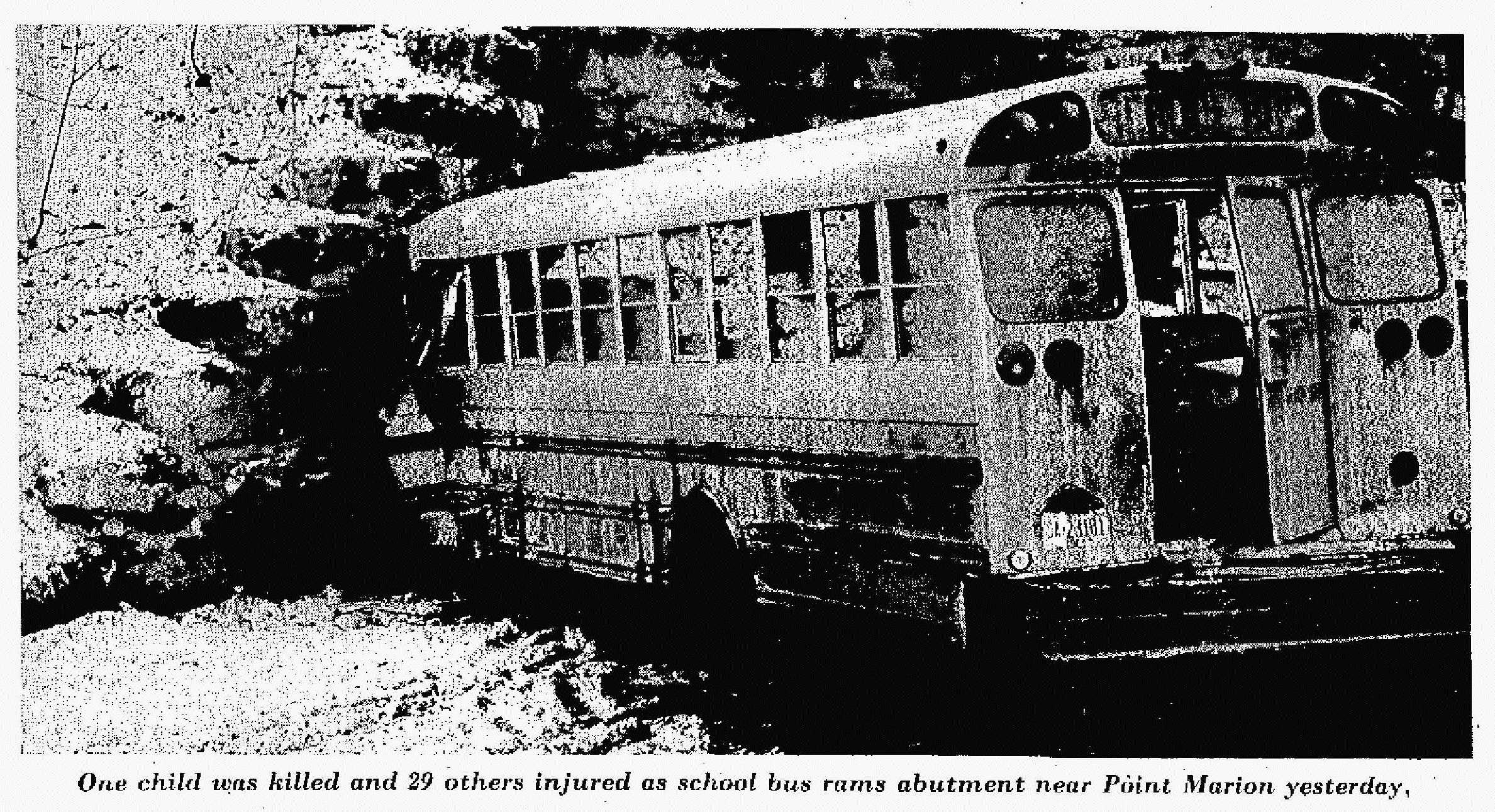 Emergency vehicles rushed 29 other persons including the bus driver to the West Virginia University Hospital in Morgantown and Uniontown Hospital. The driver of the bus, Raymond Gerald Murray, 34, of Smithfield R. D. 3, was reported in fair condition in Uniontown Hospital last night. All but three of the other injured children were treated and released. The students were all from the Friendship Hill Elementary School. Uniontown State Police, who are investigating the accident told the Herald-Standard last night the bus was traveling east when the accident occurred. Police said the bus went down a slight grade but failed to negotiate a 90 degree right turn. The bus struck a B&O railroad overpass abutment head-on. Police said the bus attempted to stop but was unable to do so. It was snowing lightly at the time of the accident and the roadway was dry and ash-covered according to troopers at the scene. Troopers also said there will be further investigation of the bus and the vehicle will be torn apart probably by the State Police garage investigator to try to determine if there was mechanical difficulty in either the steering system or brake system or elsewhere. There will also be a coroner s inquest into the mishap. Meanwhile, emergency vehicles rushed to the scene following the accident including State Police, Point Marion Vol. Fire Dept., both on and off duty Point Marion Borough Policemen and ambulances from Bobtown and Smithfield. The injured were helped out of the bus by the bus driver and a nearby resident who was identified as William Bair.