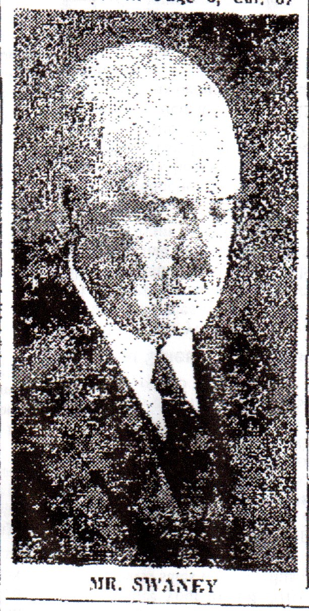 Thomas Farr Swaney, 92, retired lumber dealer, died at 3:15 a.m., Sunday, November 28, 1948, in his home, 447 Coolspring street, following an extended illness. Born in Ohiopyle, Mr. Swaney was the son of Alpheus and Lucinda Farr Swaney. His grandparents, Mr. and Mrs. David Vincent Victor, were among the first pioneers to settle in Pennsylvania from Old Virginia. Mr. Swaney was a member of the Free Methodist church. Preceded in death by his wife, Alcinda Mitchell Swaney, on April 2, 1944, he is survived by four daughters, Mrs. Tillie Gibson, Mrs. Minnie Keighley, Mrs. Edna Swaney Rhodes, Mrs. Jeannette Shaw, three sons, Clifford, Jacob M. and John C., all of Uniontown; two sisters, Mrs. Rose Ellenberger, Pittsburgh; Mrs. Lester Blaney, Uniontown; 14 grandchildren and 15 great- grandchildren. Two sons, Harry and Bud, and one daughter, Della Harper, also preceded him in death. Friends are being received after 5:30 today in the home, where funeral services will be conducted at 4 p.m. Wednesday, Rev. F. T. Diddle, of the Free Methodist church, will officiate, assisted by Dr. Cary S. Osborne, of Great Bethel Baptist church. Burial will be in Park Place cemetery under the direction of the Minerd Funeral Home.
