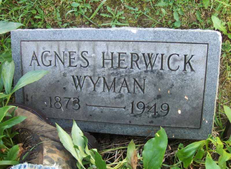 - Wyman, Agnes Herwick 1873-1949. Indian Creek Bapt. Cem., Springfield Twp. Contributor: Lanny Golden